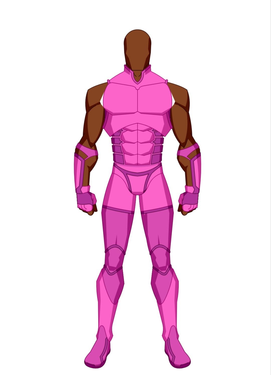 Miguel Testa, is a formidable and eye-catching superhero. Standing tall at 6’4″ and weighing 220 lbs, he has a physique that commands respect. His rich, deep black skin, accentuated by his striking white buzzcut, which adds a sharp contrast to his features and costume. His dark brown eyes, full of intensity and charm, glint behind his pink superhero mask