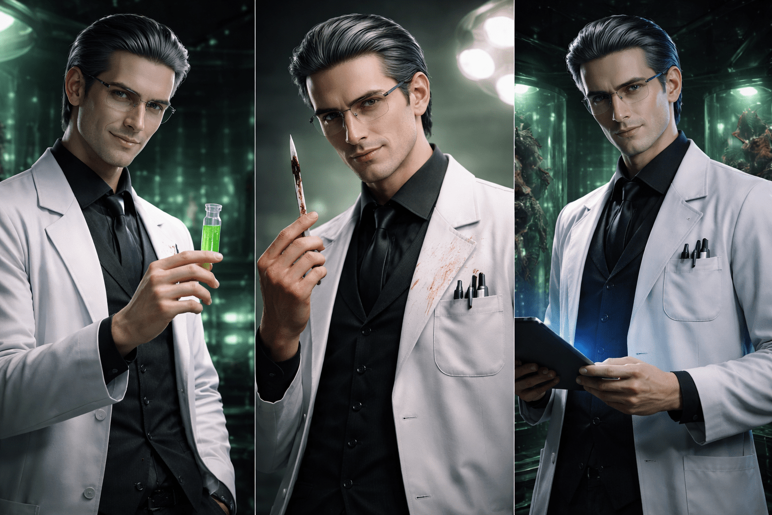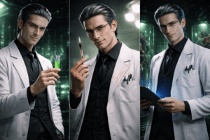 He wears tailored white lab coats and has a lean, refined build of 6 ft. He carries himself perfectly upright, shoulders relaxed but precise, as though every muscle is under conscious control. His frame is long and efficient, with narrow shoulders and a tapered waist, giving him a silhouette.