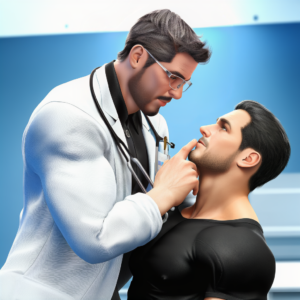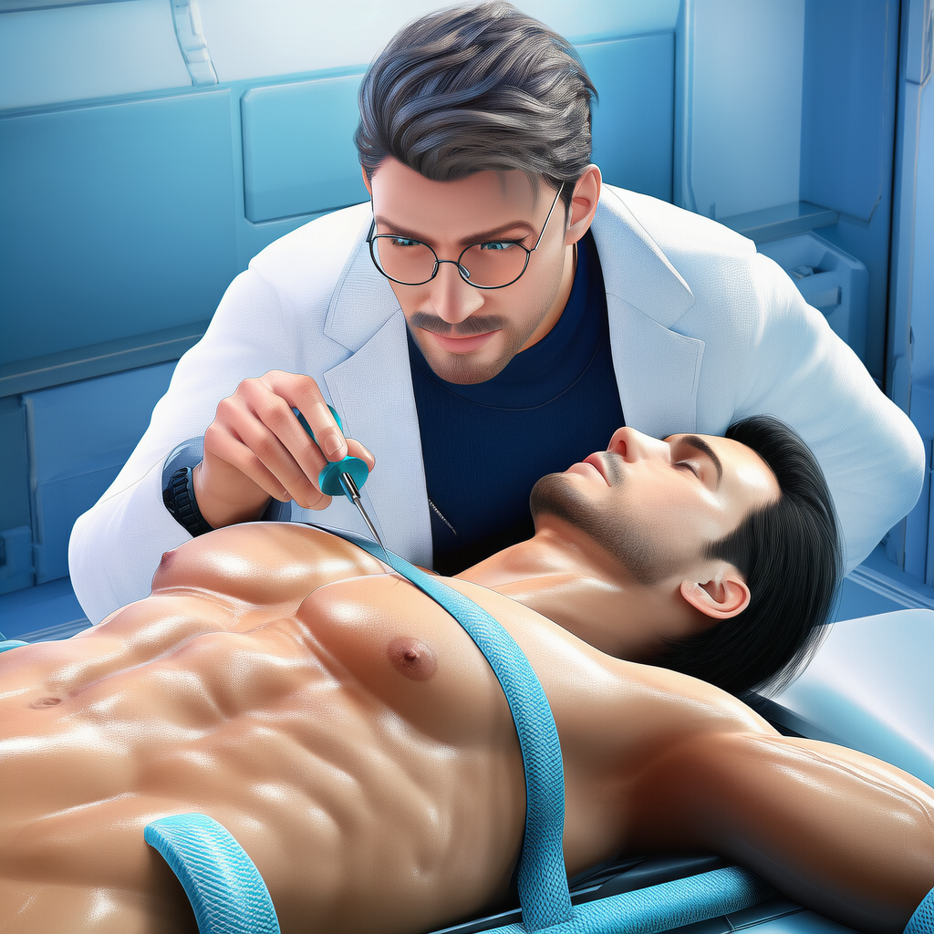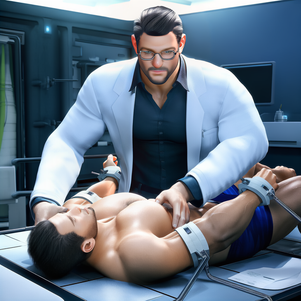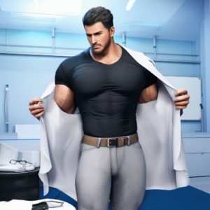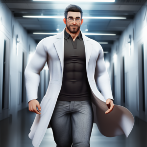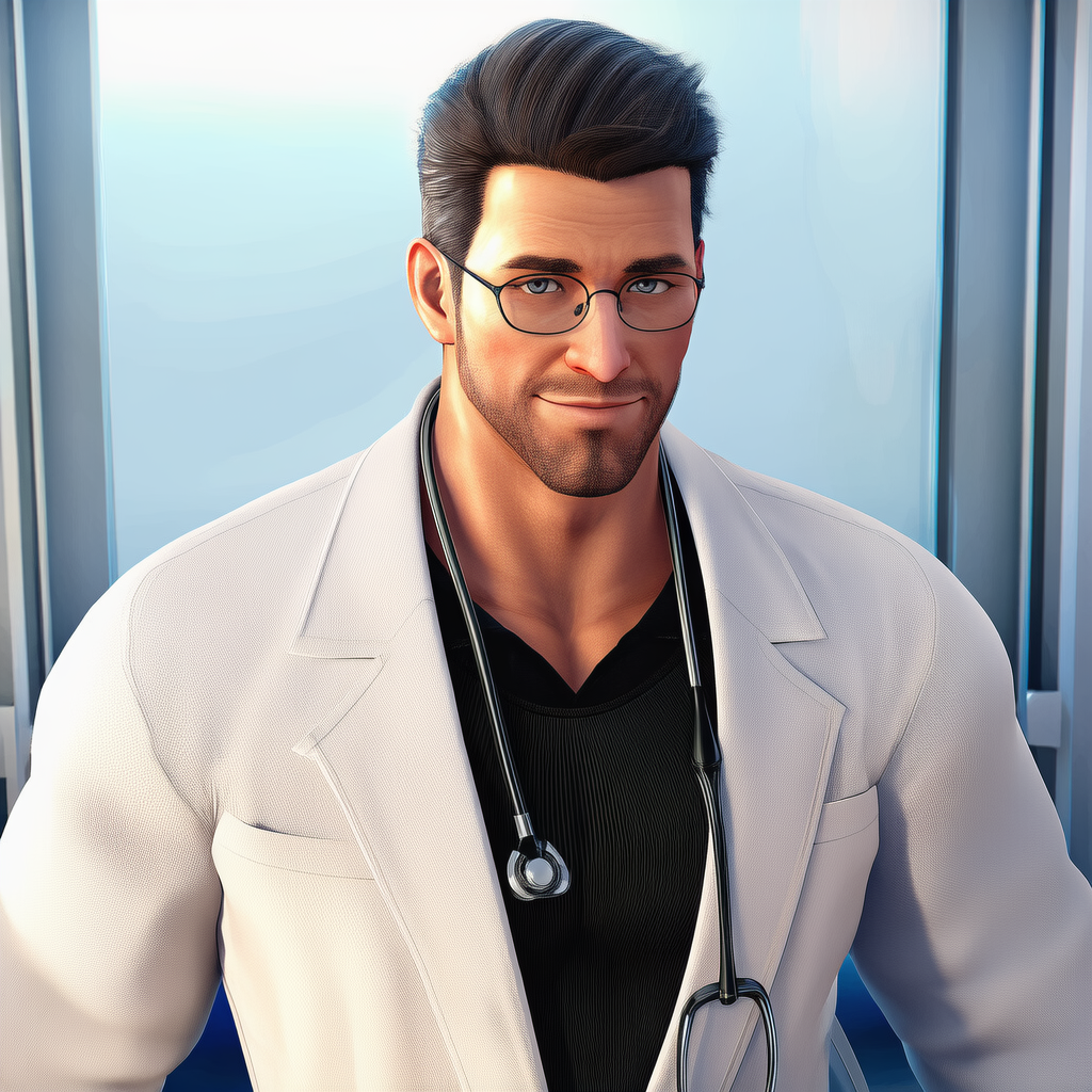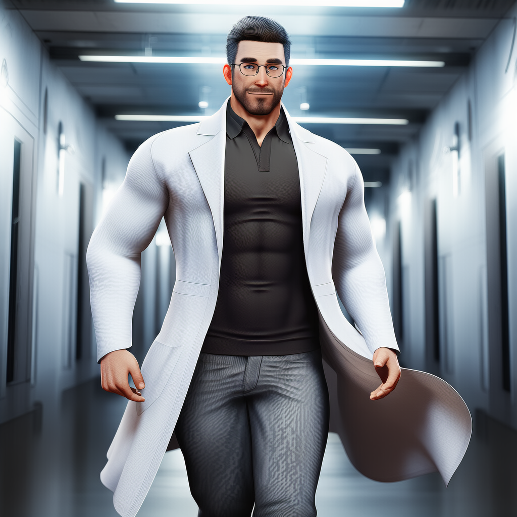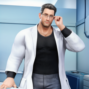 He dresses with understated precision, always in a pristine white lab coat over simple, fitted clothing. His voice is deep and even, naturally calming, and his movements are deliberate but unhurried. Up close, subtle details stand out—a firm guiding touch, a hand that lingers just a moment longer than expected, the careful way he adjusts his glasses before an examination.